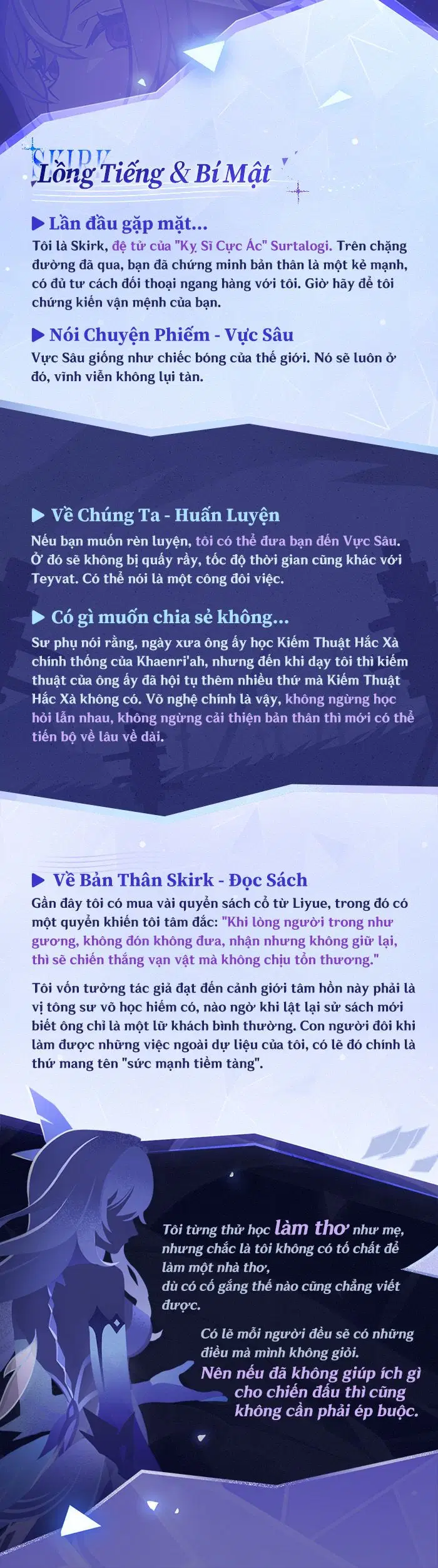 Nhà Lữ Hành thân mến! Hãy cùng xem những câu chuyện về Skirk nhé!